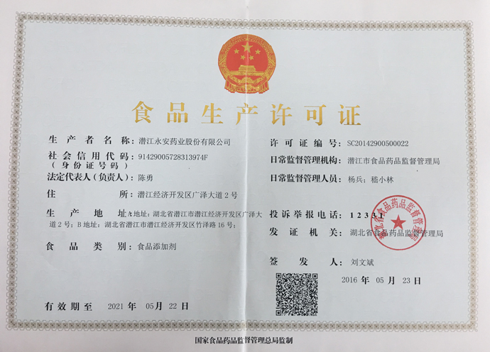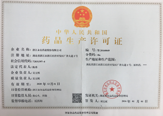 潛江永安藥業(yè)股份有限公司成立于2001年,坐落于江漢平原腹地潛江市國家高新技術產業(yè)開發(fā)區(qū),占地500余畝,注冊資金貳億玖仟肆佰陸拾捌萬貳仟伍佰元整,是一家擁有自主知識產權的國家高新技術企業(yè)。公司股票于2010年3 月5日在深圳證券交易所掛牌上市(股票代碼為002365)。公司具有雄厚的技術開發(fā)能力,是湖北省創(chuàng)新型企業(yè)和湖北省知識產權建設示范企業(yè)。公司研發(fā)平臺分別被認定為省級企業(yè)技術中心和湖北省功能性食品添加劑工程技術研究中心。 經過多年的發(fā)展,公司形成了以食品及藥品添加劑牛磺